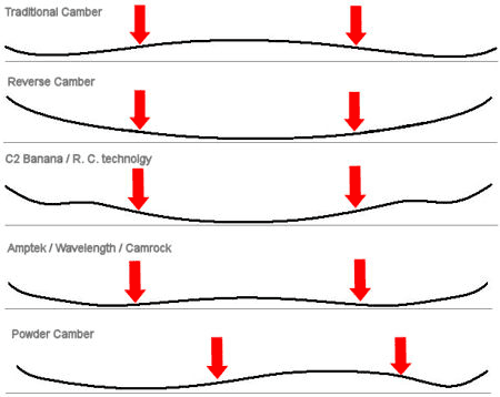 Par contre pour des modèles semblables sur les autres paramètres (sidecut, flex, etc), la différence de comportement peut être très importante, et va généralement dans le sens décrit : en cambre inversé on a une board qui est plus pivotante, pardonne plus les erreurs et déjauge plus en poudreuse, mais par contre est moins incisive en déclenchement, a une accroche moins franche, moins de pop et est moins adaptée à une conduite en torsion.